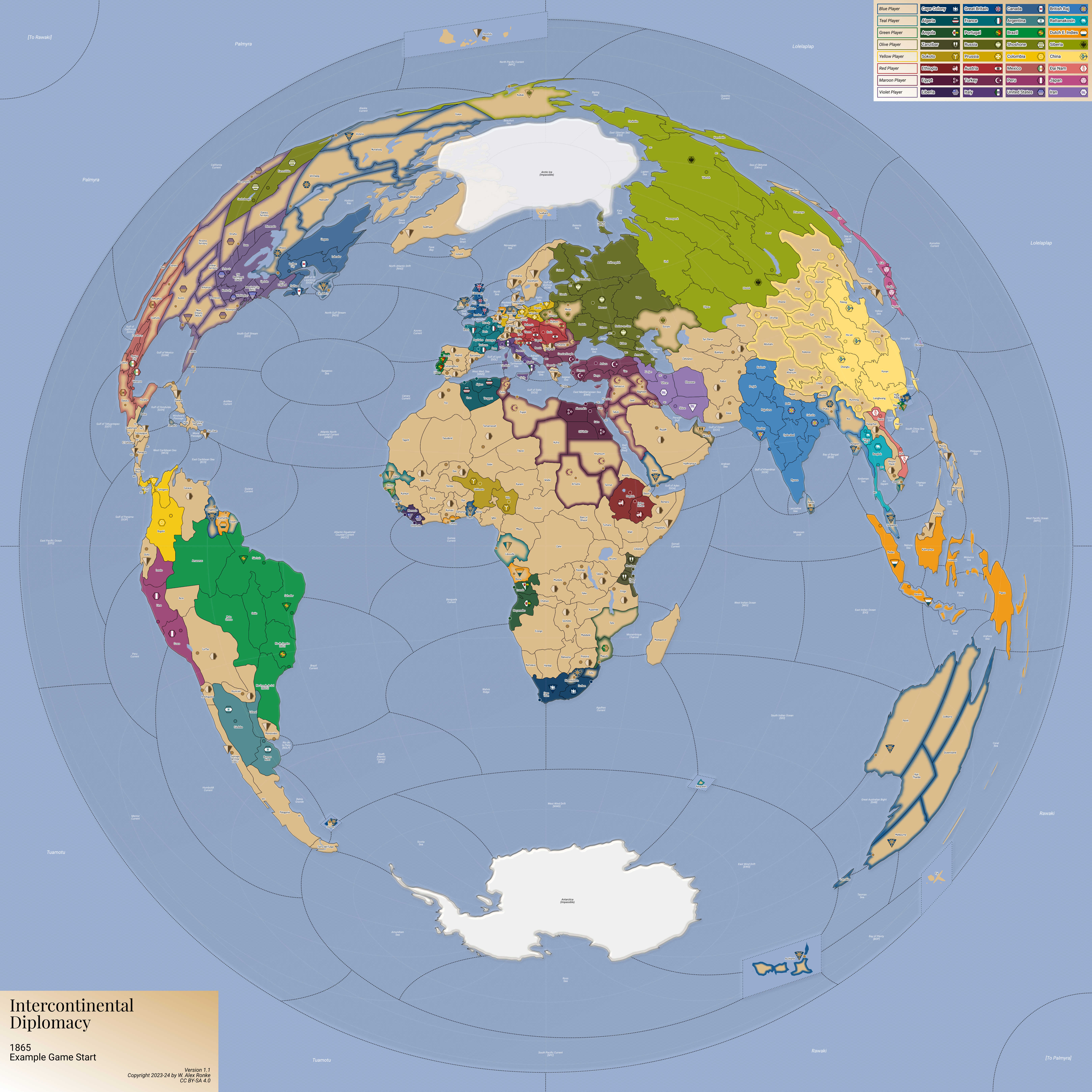 Intercontinental (IC) is a Diplomacy variant for eight players set circa 1865. It takes place on a global scale across multiple continents, with each player controlling four distinct powers.