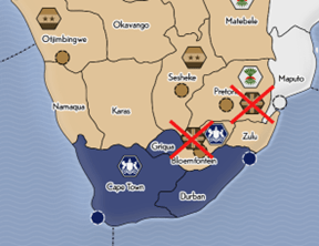 In this second image, we see the results. Otjimbingwe remains in place. Bloemfontein and Pretoria are both dislodged, and because they are stationary units, they are automatically disbanded, as they cannot retreat.