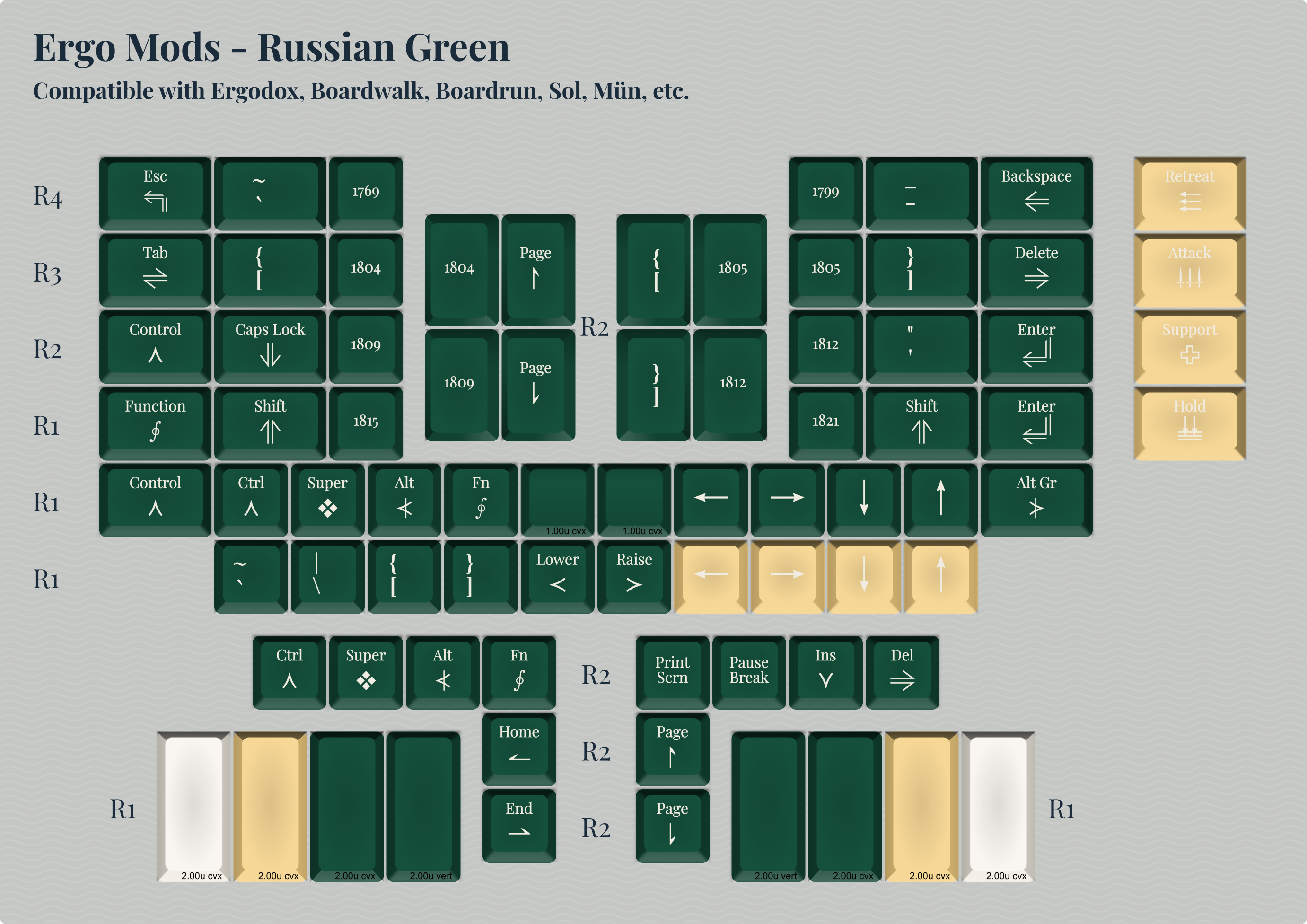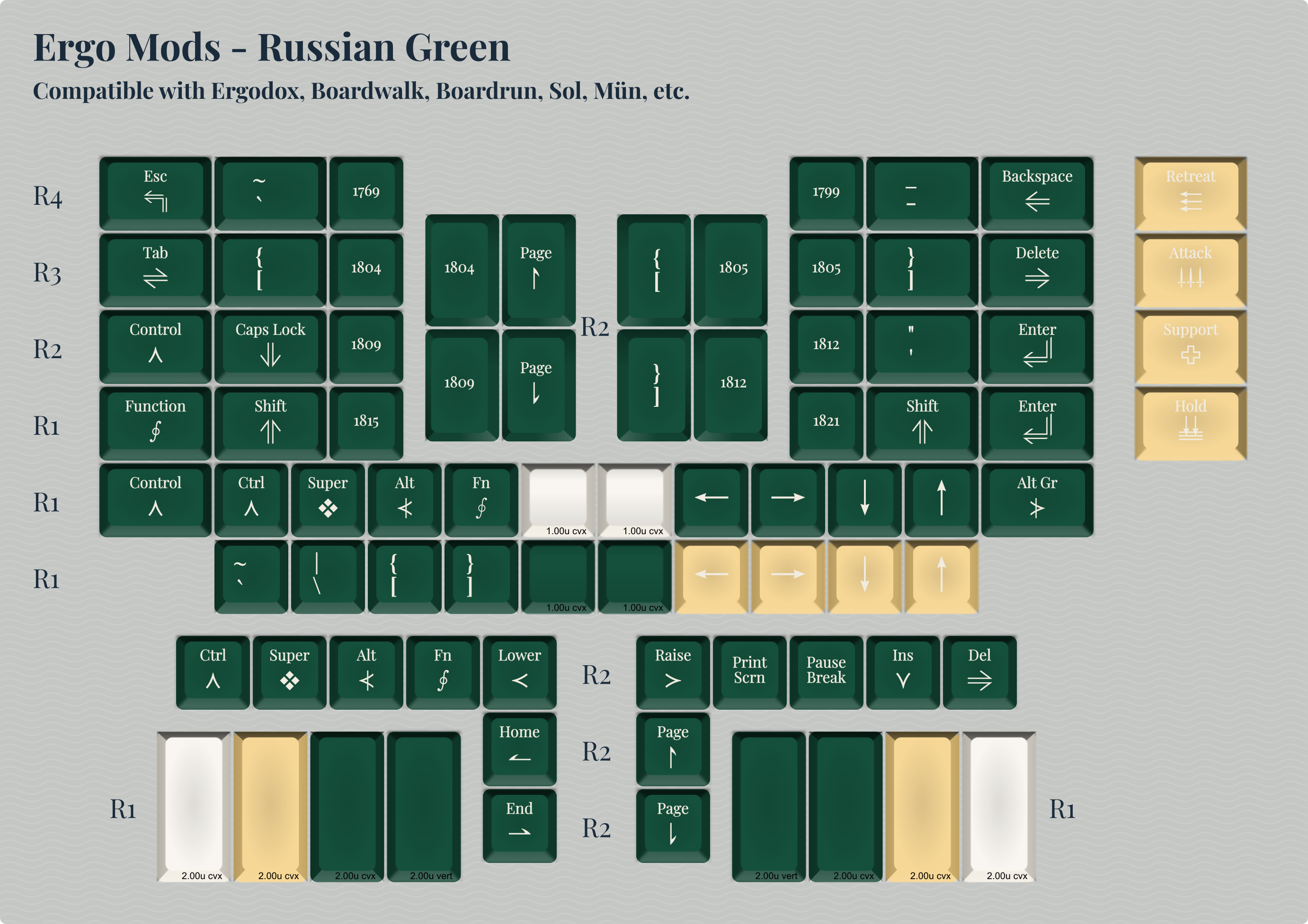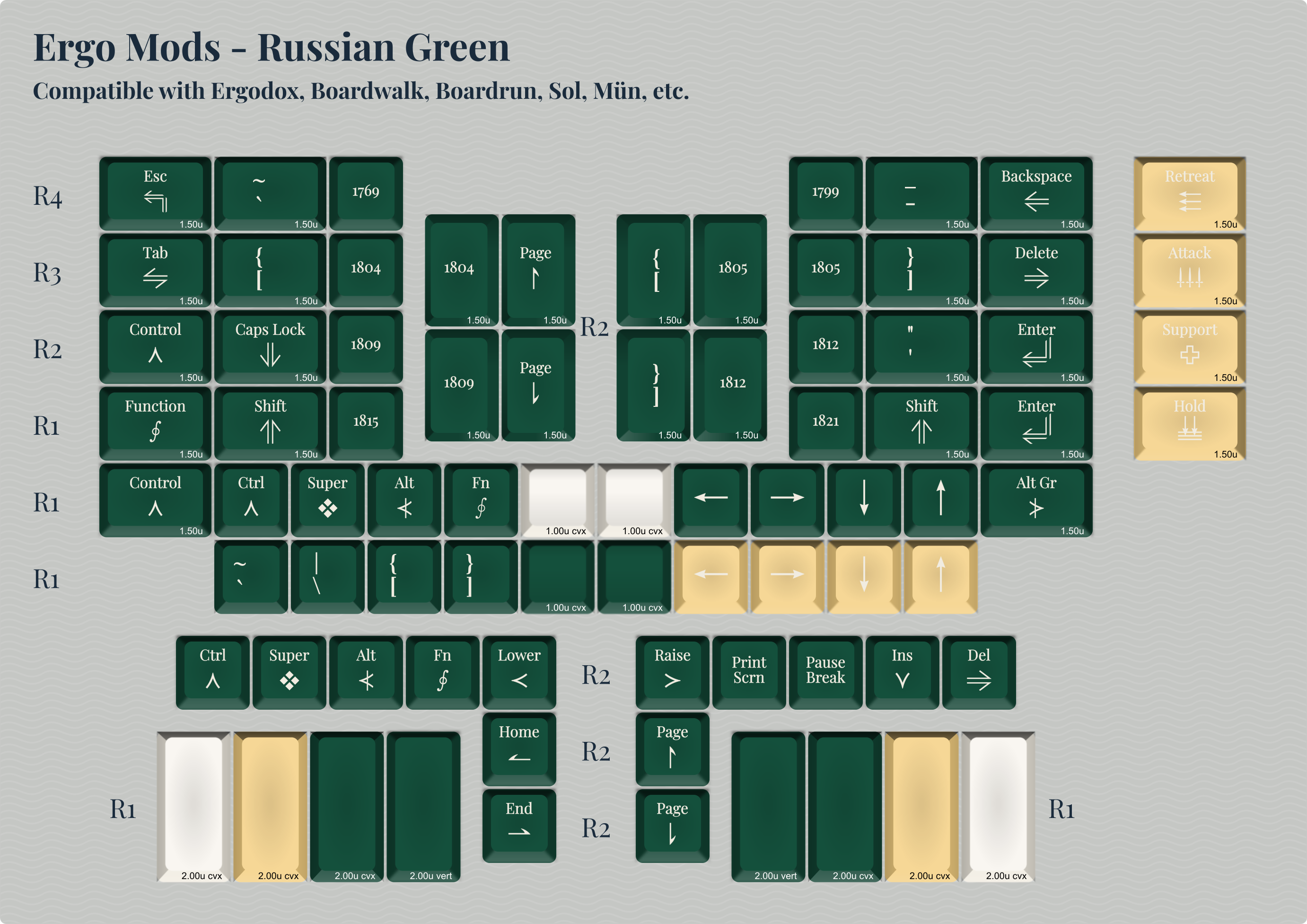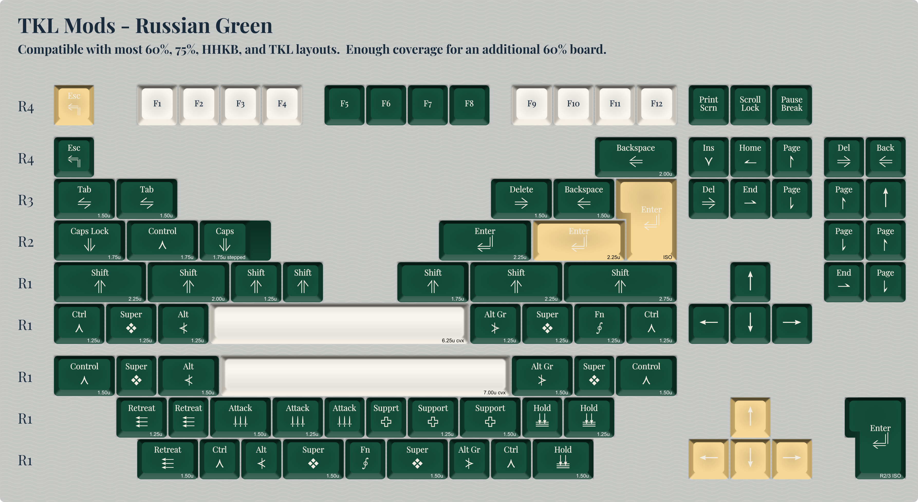 Russian Green mods are marked with text-and-icons. Like modern Russian keyboards, they use standard English text and abbreviations for all modifier labels.