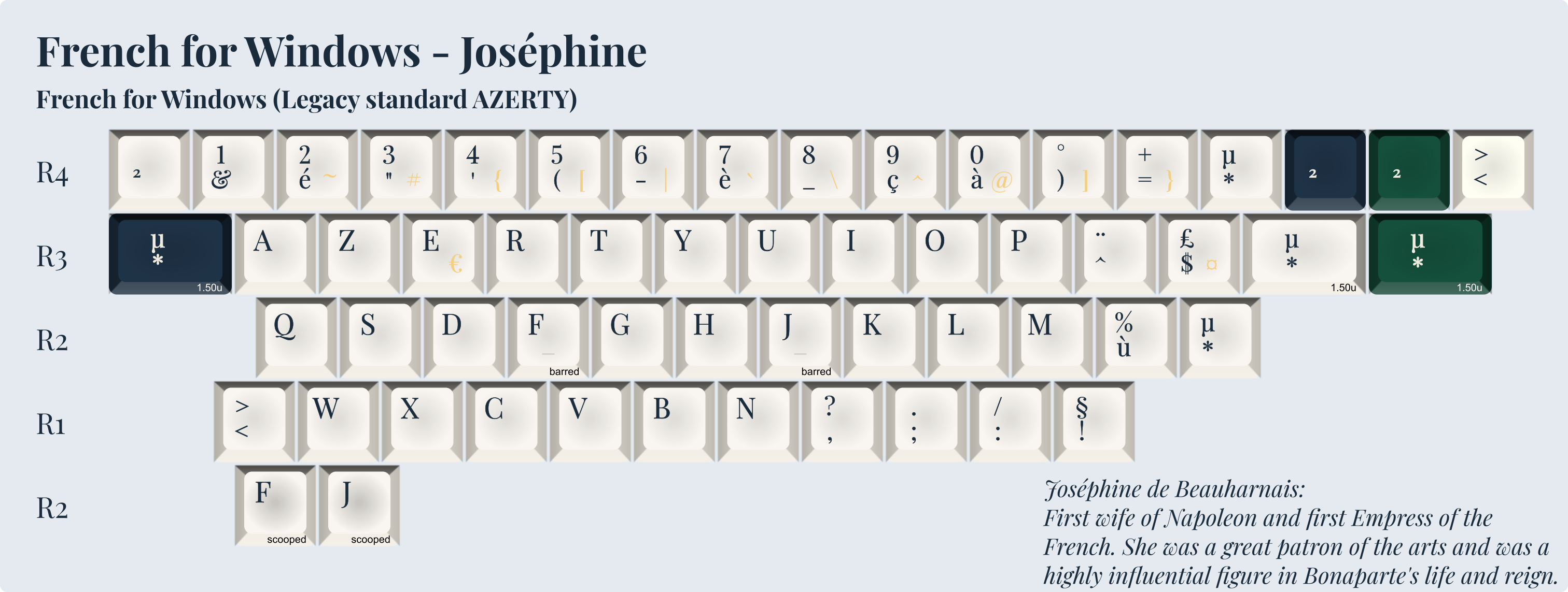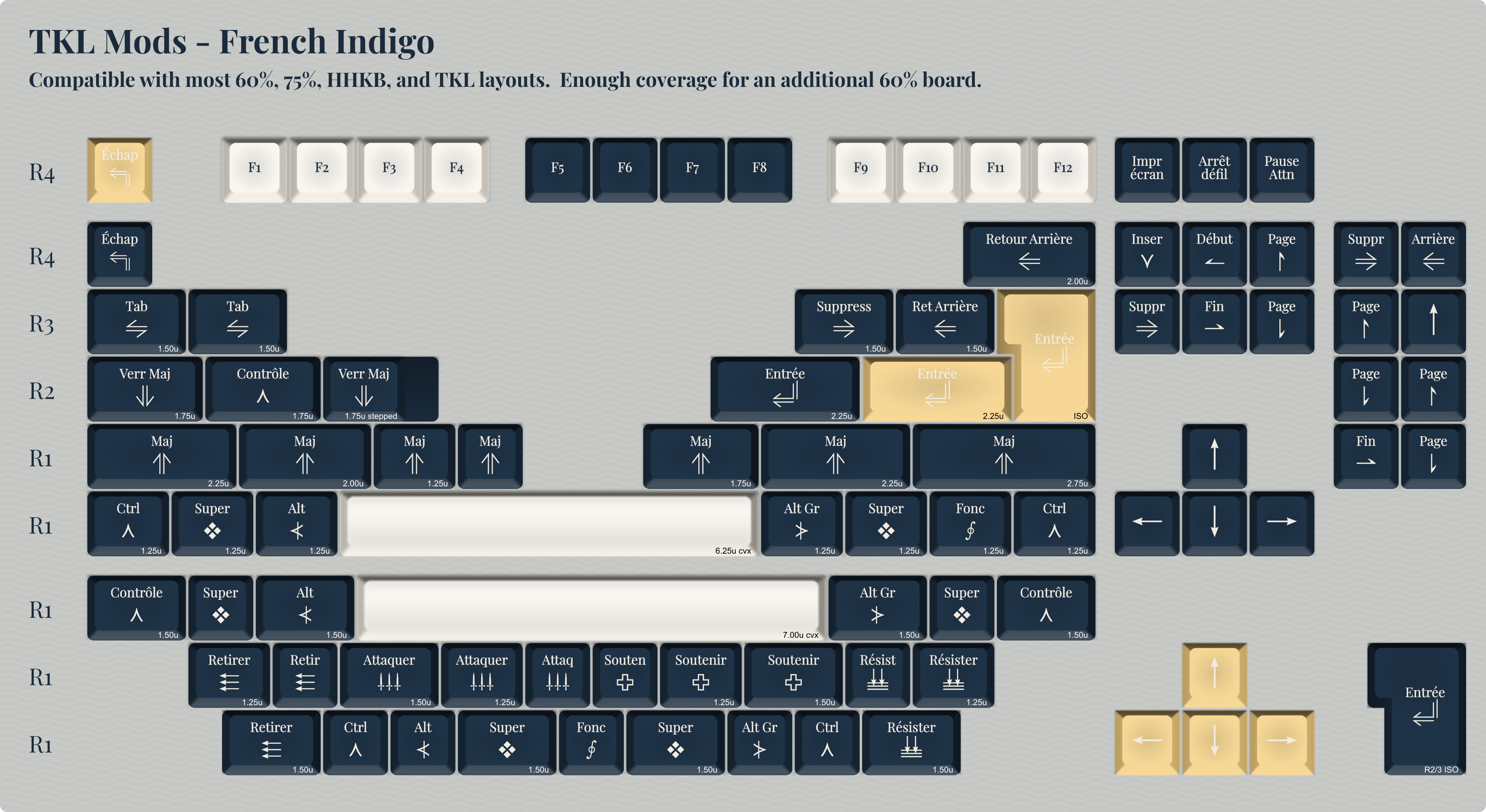 French Indigo mods are marked with text-and-icon legends. Where possible, these legends use actual terminology from modern French keyboards: the abbreviation Maj to represent Shift, Entrée for Enter, et cetera.