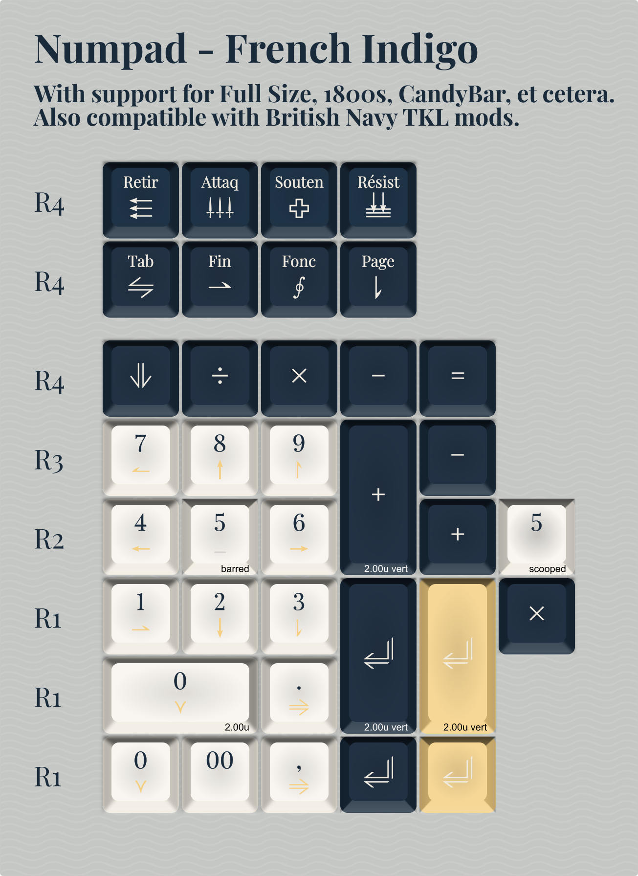 The British Navy colorway will be available for a single mods kit for mainstream TKL, 60%, and 70% boards. Its primary mod colors are the same as French Indigo but has more mainstream legends.