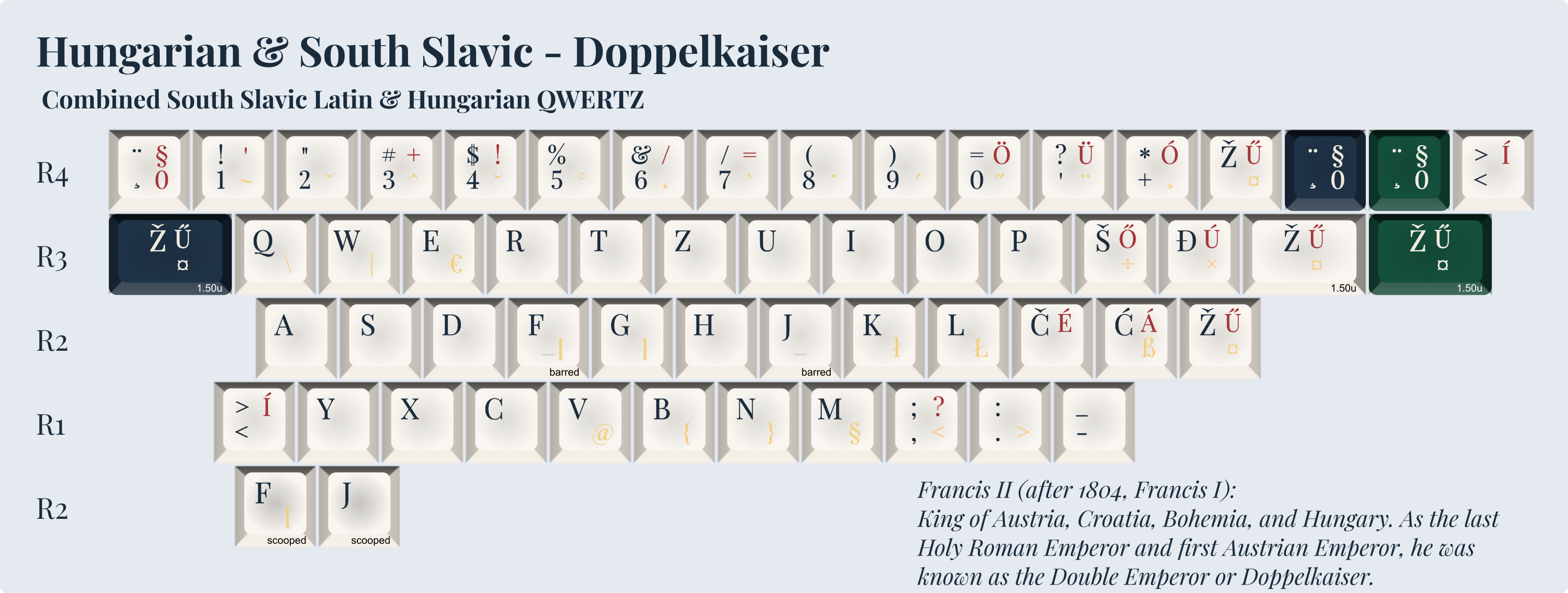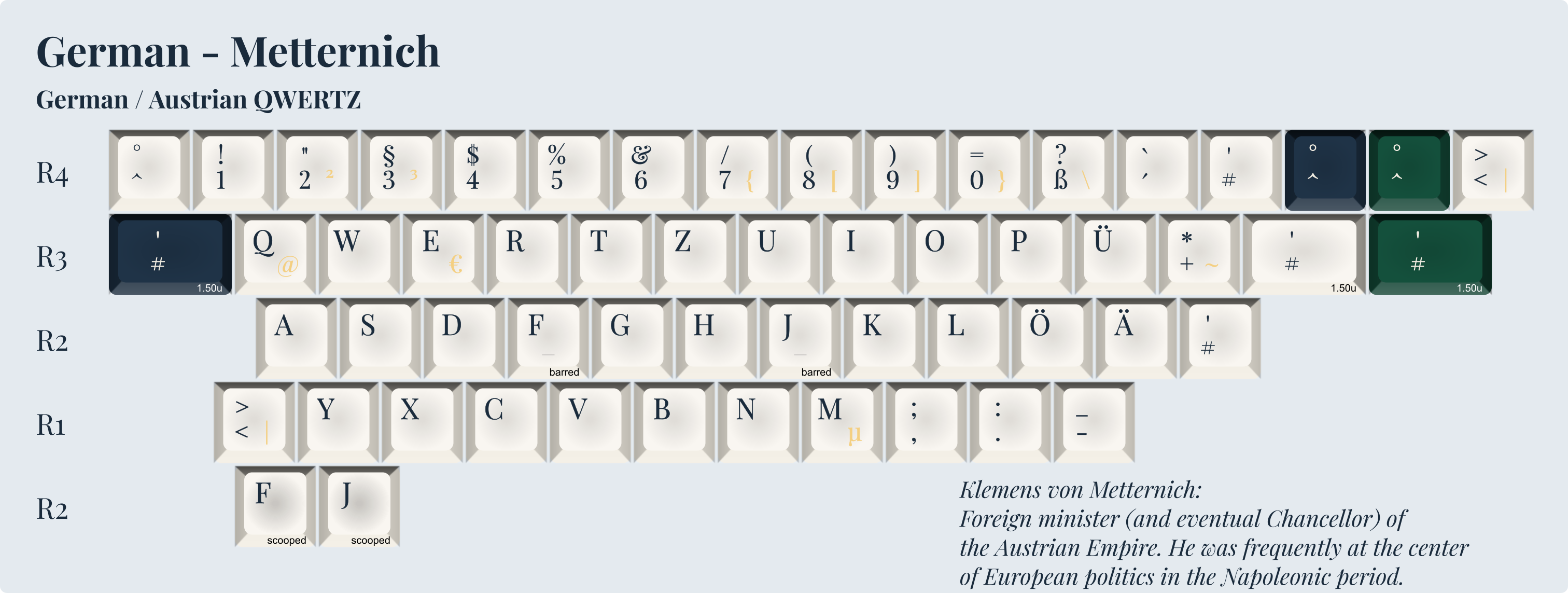 Keyboards used in German-speaking countries like Austria typically use a standard set of icons for major modifiers (Enter, Shift, et cetera) with no text. KAT Napoleonic extends this pattern to the whole keyboard; the Austrian White uniform is an icons-only option for traditional and ortholinear keyboards.