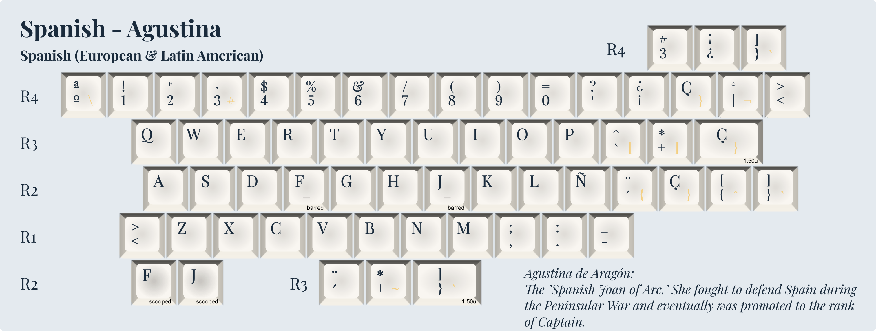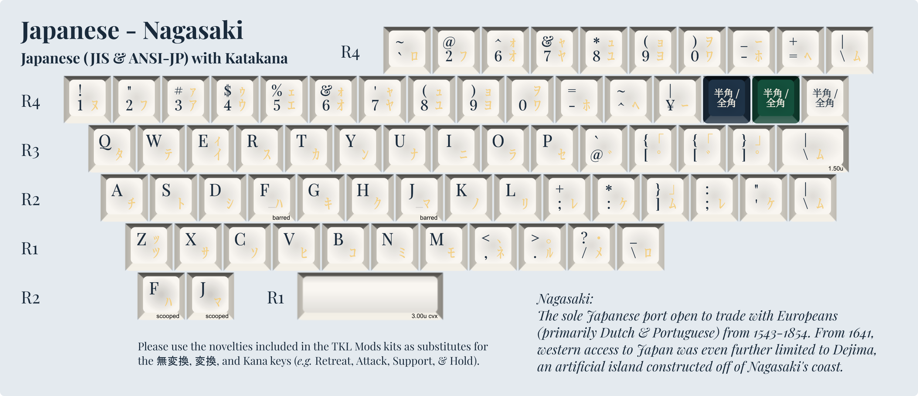KAT rows are numbered bottom-to-top, with the lowest (shift and spacebar rows) labeled R1, the home row labeled R2, the Q row labeled R3, et cetera. KAT Napoleonic will use a 4-4-3-2-1-1 sculpt analogous to what is commonly seen in Cherry or SA-profile keycaps.