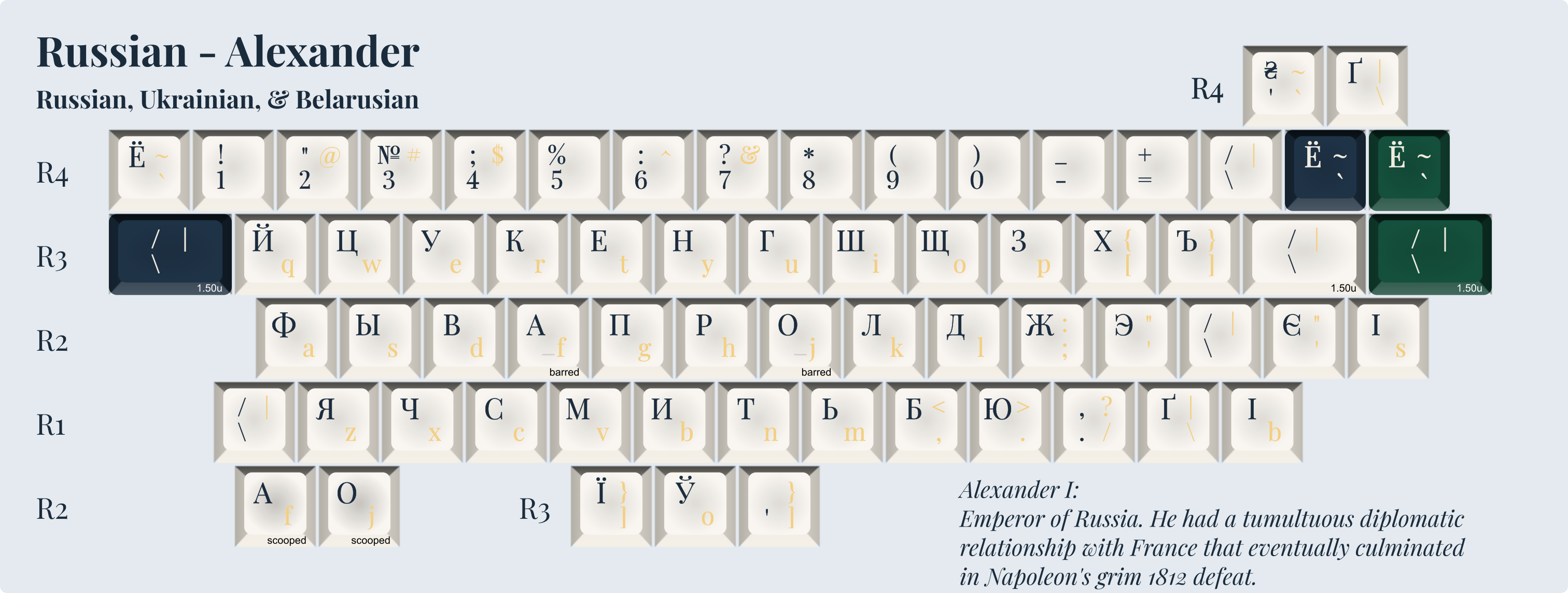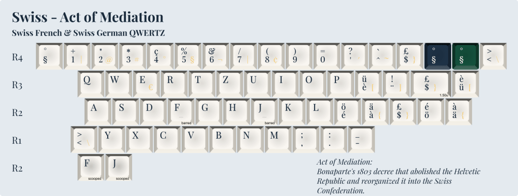 While this keyset cannot feasibly provide support for every language worldwide, KAT Napoleonic supports more than twenty-one locales in base alpha kits. Kits available include many that are rarely (if ever) seen in the Mechanical Keyboard hobby: Swiss, BÉPO, South Slavic, Tamil, Cherokee, and Canadian French.