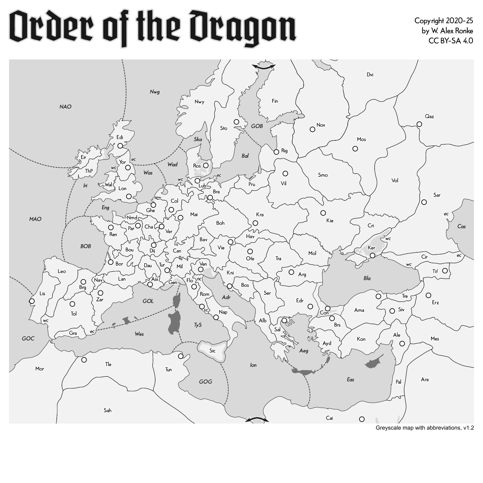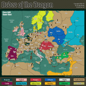Order of the Dragon (OOD) is a Diplomacy variant for ten players set in the 15th century. OOD incorporates more advanced features such as Diplomacy Points (DP), Heirs, Minor Neutral Powers, Thrall Powers, and Vassal Powers. Many of these features were introduced in another variant, Saga of the Nine, and much of the rules text is identical. OOD is comparable in complexity to Ambition & Empire (VonPowell, Kase, & Ronke), the variant that originated the Diplomacy Points mechanic (DP).