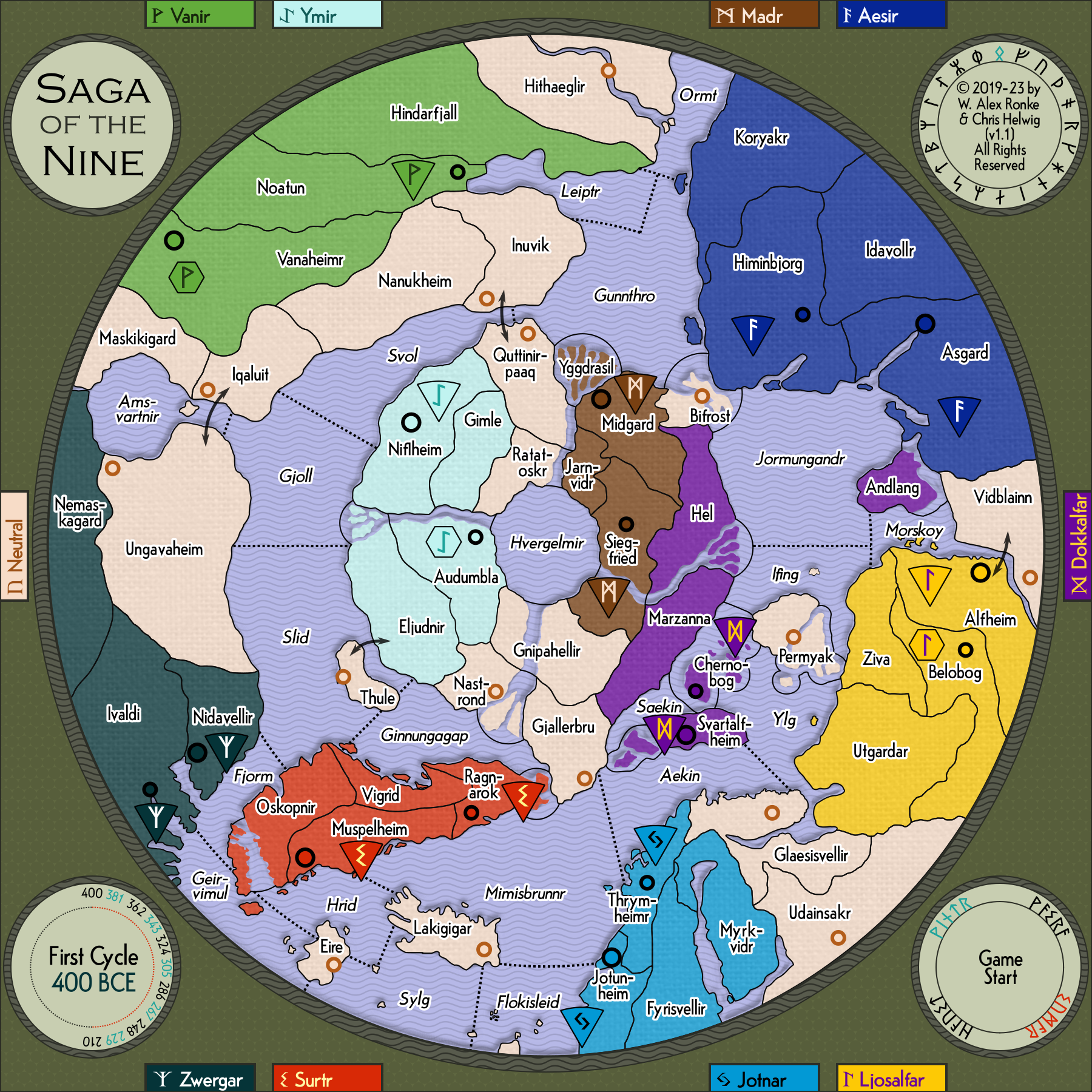 Each player will lead one of nine powers in the region: the Aesir, Dokkalfar, Jotnar, Ljosalfar, Madr, Surtr, Vanir, Ymir, and Zwergar. Centuries later in this alternate Earth, the stories of these nine powers and their conquests will be spun and reshaped until they reach mythical proportions. These nation-states led by mortal humans will be transformed by generations of storytellers into giants, dwarves, elves and deities; they will become the basis of the Nine Worlds of Norse mythology.